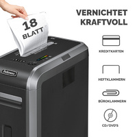 Fellowes Aktenvernichter Powershred 125i, Streifen 5,8 mm,CH ------------------ für den Markt: CH ----------------------- Schnittleistung: 18 Blatt, Auffangvolumen: 53 Liter, Arbeitsbreite: 230 mm, Sicherheitsstufe: P-2/O-2/T-2, ver- nichtet CDs/Kreditkarten/Heft-/Büroklammern, schwarz/silber, 100% staufrei, Maße: (B)286 x (T)535 x (H)735 mm (4613601) CH-Stecker, SilentShred minimiert Geräuschpegel SafeSense stoppt automatisch bei Berührung des Papierauszugs